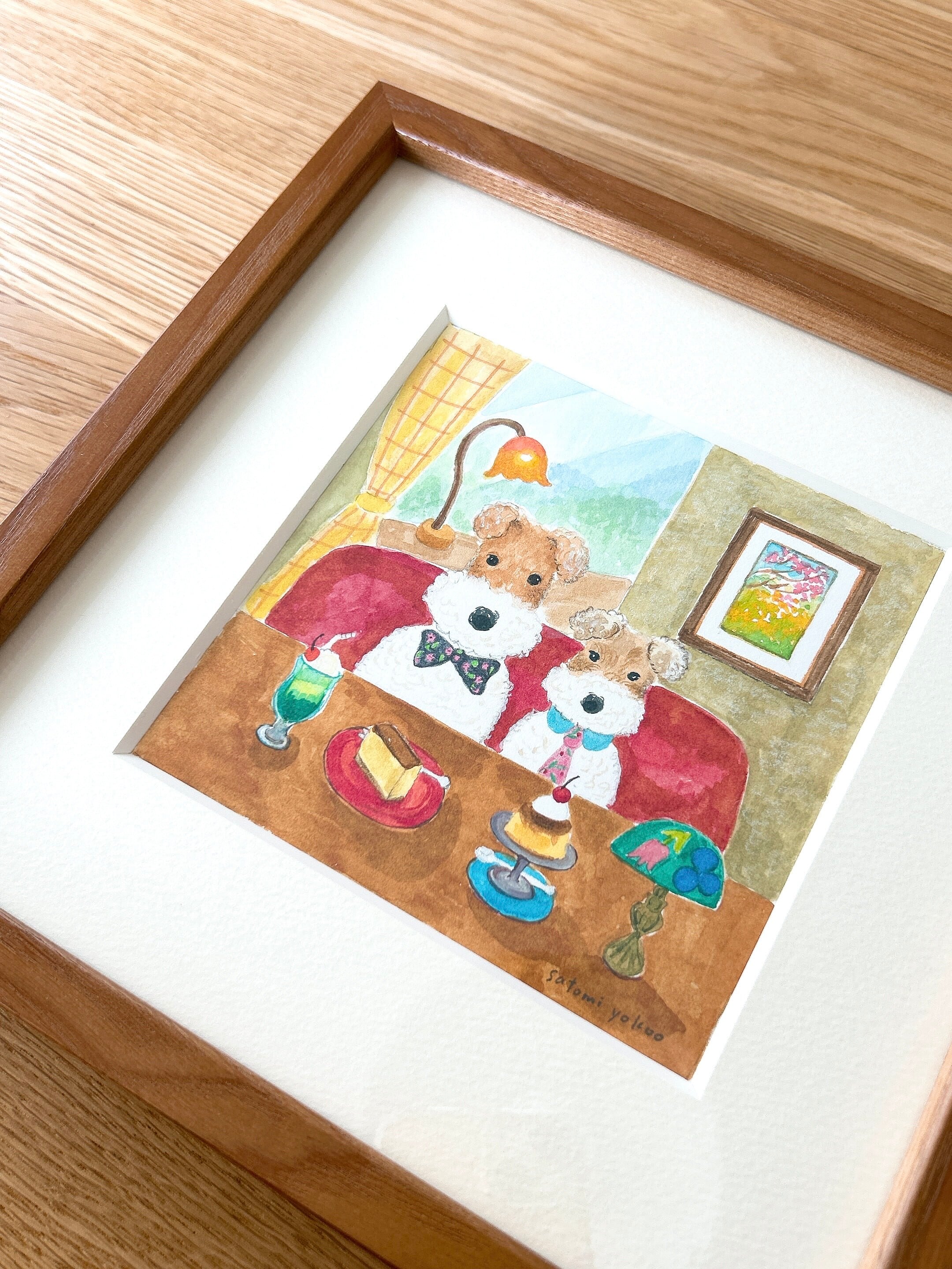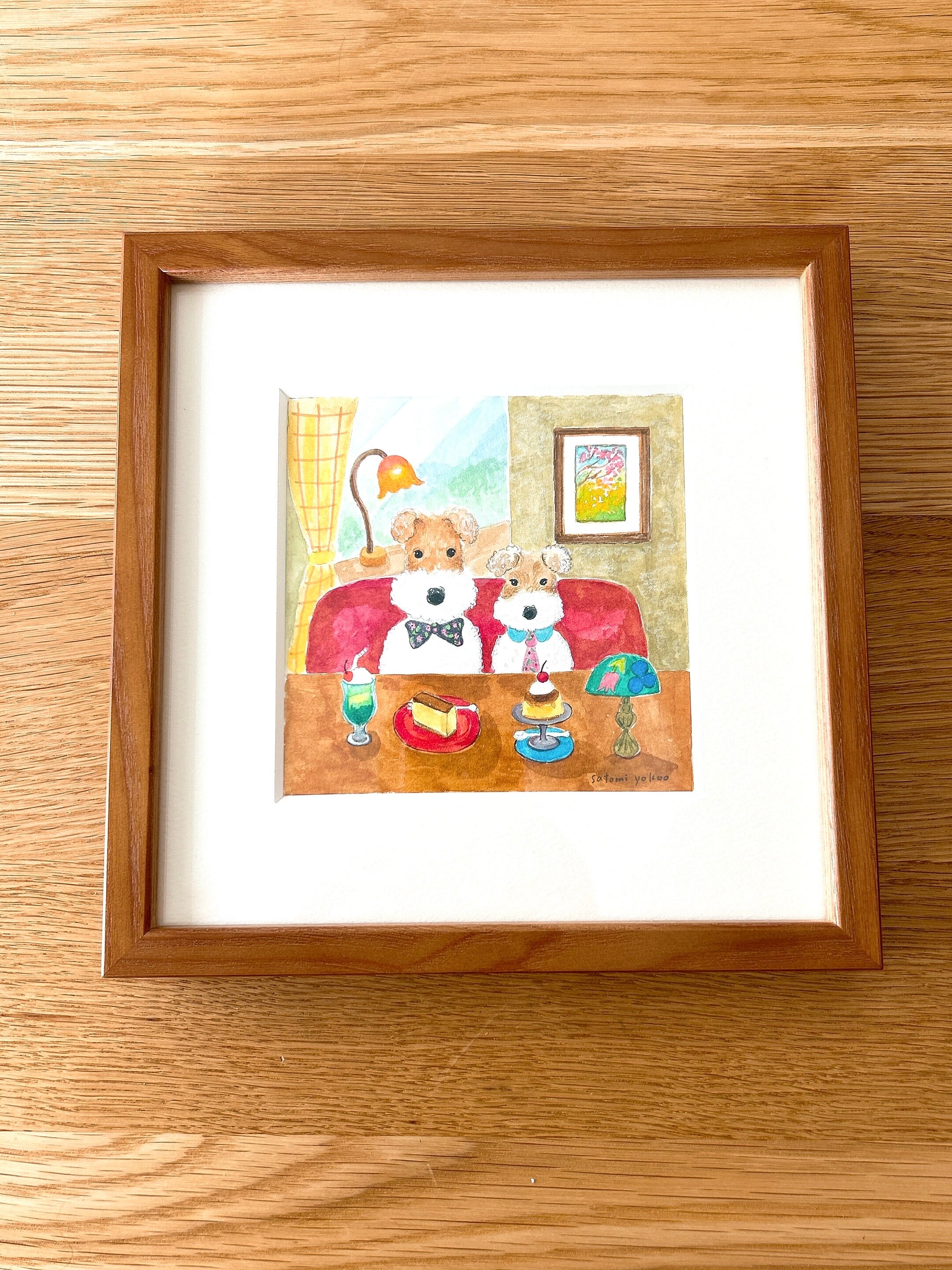 レトロな喫茶店でワイヤーフォックステリアのおやつの時間です。プリンとカステラを選びました。